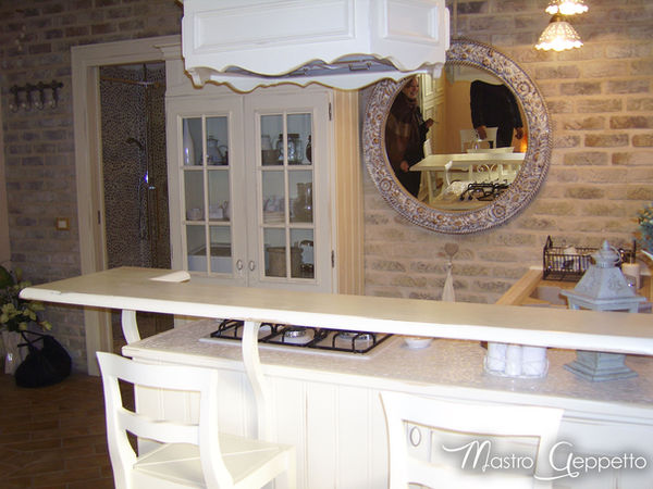 Questa cucina è un perfetto esempio di cucina artigianale su misura in stile provenzale, pensata per un ambiente caldo, accogliente e ricco di personalità. Gli arredi, realizzati in legno massello laccato bianco panna, sono caratterizzati da linee morbide, cornici lavorate e dettagli romantici come i pomelli a forma di cuore. Il piano di lavoro in piastrellina chiara si integra armoniosamente con la parete in mattoni a vista, trattata in toni neutri che richiamano la pietra naturale.