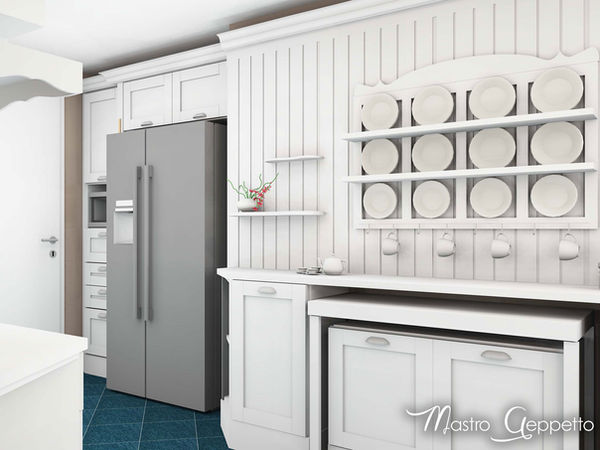 Un elemento di spicco è la scaffalatura porta-piatti a vista, con mensole ricurve e ganci per le tazze, anch'essa di un bianco immacolato, che espone una collezione di piatti bianchi, rafforzando l'estetica provenzale. Lungo la parete, sono presenti mensole a giorno aggiuntive per oggetti decorativi.