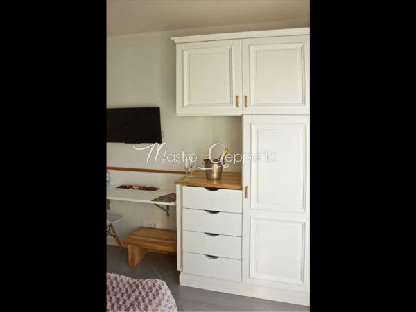 Sulla parete opposta si trova un armadio su misura, realizzato in legno laccato bianco con maniglie dorate opache, che richiama lo stile classico rivisitato in chiave moderna. Accanto ad esso una zona scrittoio con mensola e piano estraibile permette di ricavare una postazione lavoro ben integrata. La sedia è ergonomica e leggera, perfetta per piccoli spazi. Un tocco distintivo lo dà lo specchio a figura intera che amplifica la luce naturale proveniente dalla porta finestra, rendendo l’ambiente ancora più luminoso. In un angolo, una mini cassettiera con piano in legno naturale accoglie un secchiello portabottiglie, utile ma anche decorativo.
